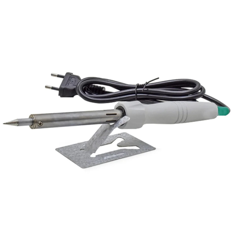 O ferro de solda é uma ferramenta essencial para realizar conexões elétricas utilizando estanho. Sua ponta aquecida permite derreter o estanho para uma soldagem eficaz. A reposição é fácil, bastando apenas dois parafusos para trocar a ponta e a resistência. Além disso, possui um tubo ventilado que ajuda a dissipar o calor, aumentando a durabilidade da resistência.