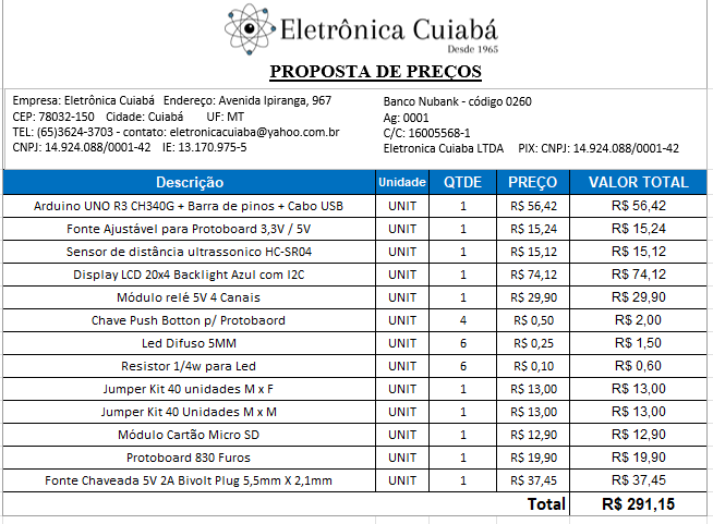 | Módulo Cartão Micro SD | UNIT | 1 | R$ 12,90 | R$ 12,90 |